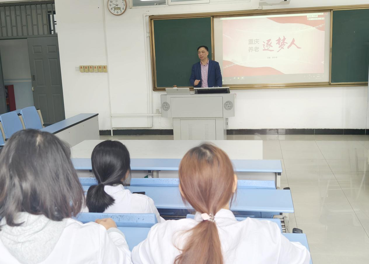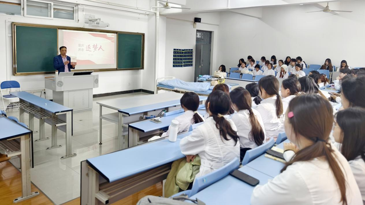 宣讲现场,郭秘书长结合重庆老龄化发展现状与银发经济政策红利,用详实数据解读行业发展机遇。作为西部老龄化领跑城市,重庆已实现三级养老服务网络全覆盖,智慧养老与医养结合等新兴领域正亟需大量专业人才,行业发展潜力巨大。他分享了一线养老工作者的暖心服务故事,生动诠释了“专业技能是根基,人文关怀是灵魂”的职业理念,鼓励同学们重点深耕智慧养老技术应用、老年心理照护等核心能力,以专业素养为老年群体提供有温度的服务。