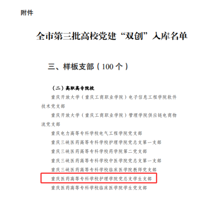 近日,中共重庆市委教育工作委员会公布了重庆市第三批新时代高校党建示范创建和质量创优(“双创”)工作评选结果,护理学院学生党支部成功获评高职高专院校类“样板支部”。这是上级党委对我院基层党组织建设工作的充分肯定,更是学生党支部全体党员和师生共同努力的珍贵荣誉。